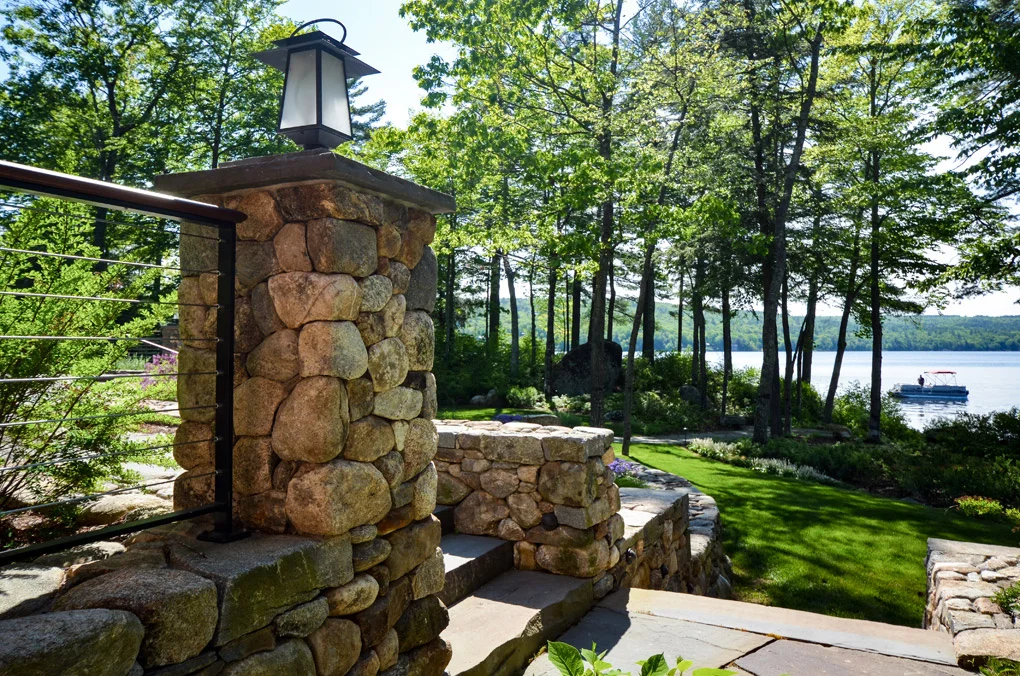 THE DESIGN PROGRAM FOR THIS HOME SHARES COMMON GOALS TYPICAL IN NATURE TO MANY LAKEFRONT HOMES; provide large entertaining spaces for family gatherings, intimate spaces for daily life, unobstructed lake views, and enhance and respect the natural environment. This sloping lakefront site did present a unique design challenge. The program called for outdoor space adjacent to the first-floor spaces including the kitchen, living room, and great room, allowing their functions to extend beyond the walls of the home, meaning the landscape would need to rise and meet the home’s first floor. On-grade exterior space was designed to terrace away from the residence gently. Artfully crafted NH fieldstone walls retain grade and form a series of planters. A mix of deciduous and evergreen shrubs and perennials offer a contrast to the rigidity of the walls, provide blooms May through frost, and present exciting textures in the winter months. The climbing hydrangeas have become a feature, growing more elegant each year as they help to soften the tallest retaining wall in the landscape.