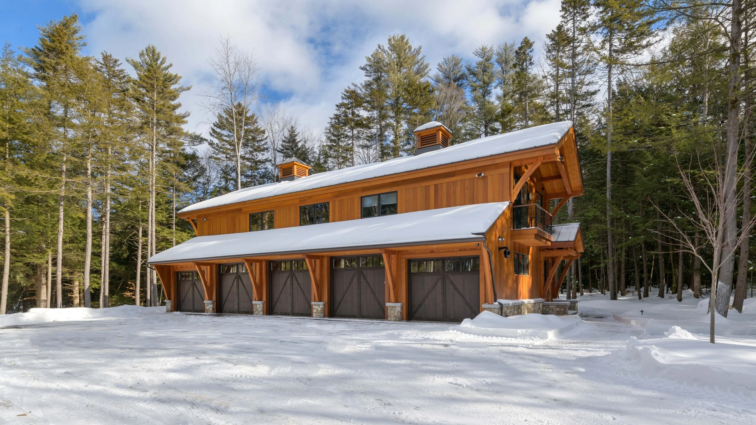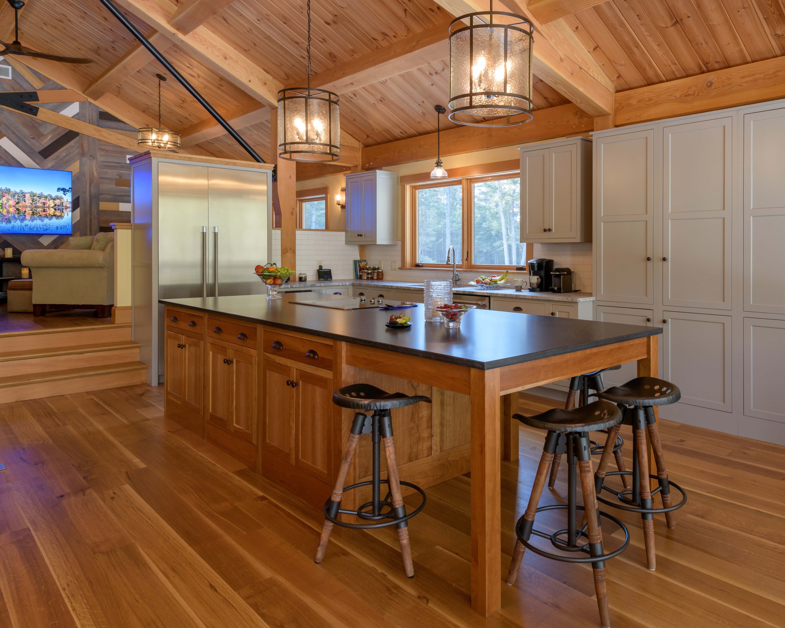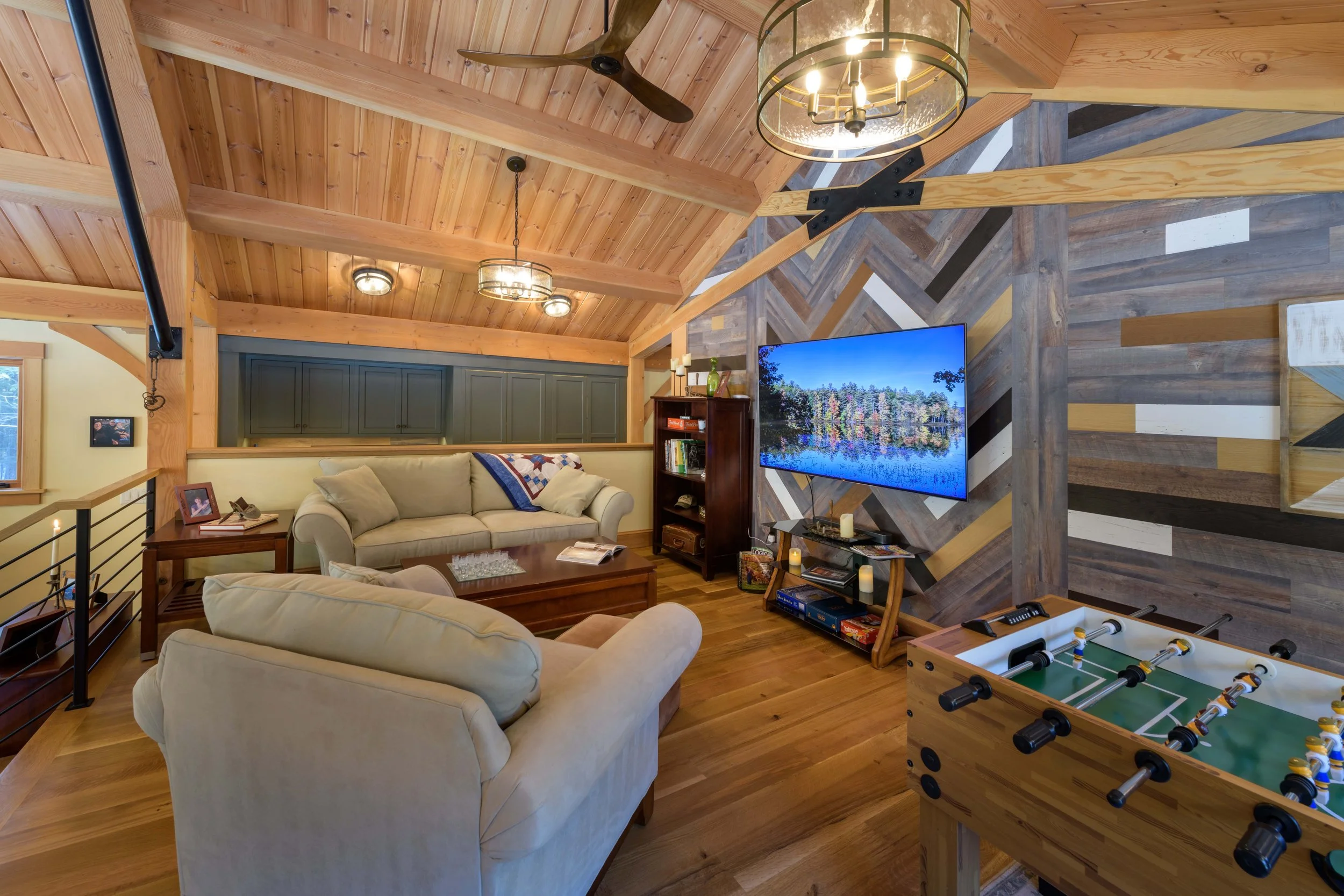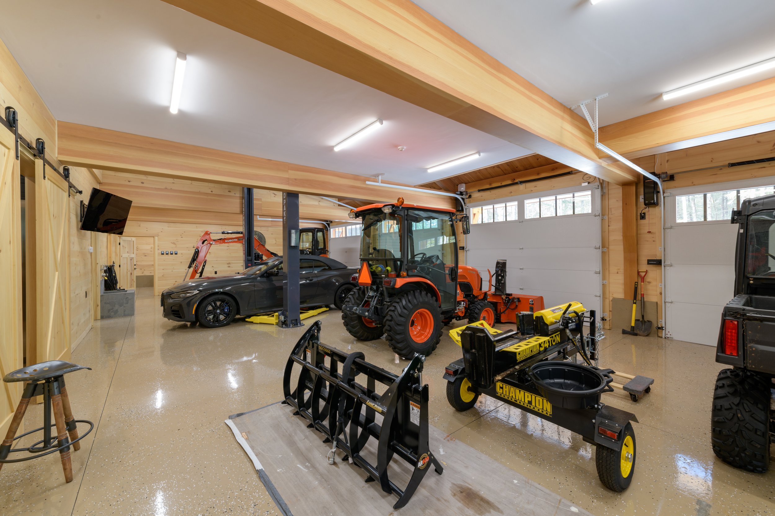 This barn-style space has five bays for cars and equipment, a workshop, and a full bathroom, all on the first floor, plus room for storage, tools, and easy access to clean up after chores. The second floor has two bedrooms, two baths, and ample living space. The kitchen, living, dining, and bar area are open to one another and showcased by the timber-framed cathedral ceiling—a covered deck with views to the river. Guests, family, and friends can relax comfortably above the functional storage and workspaces below.