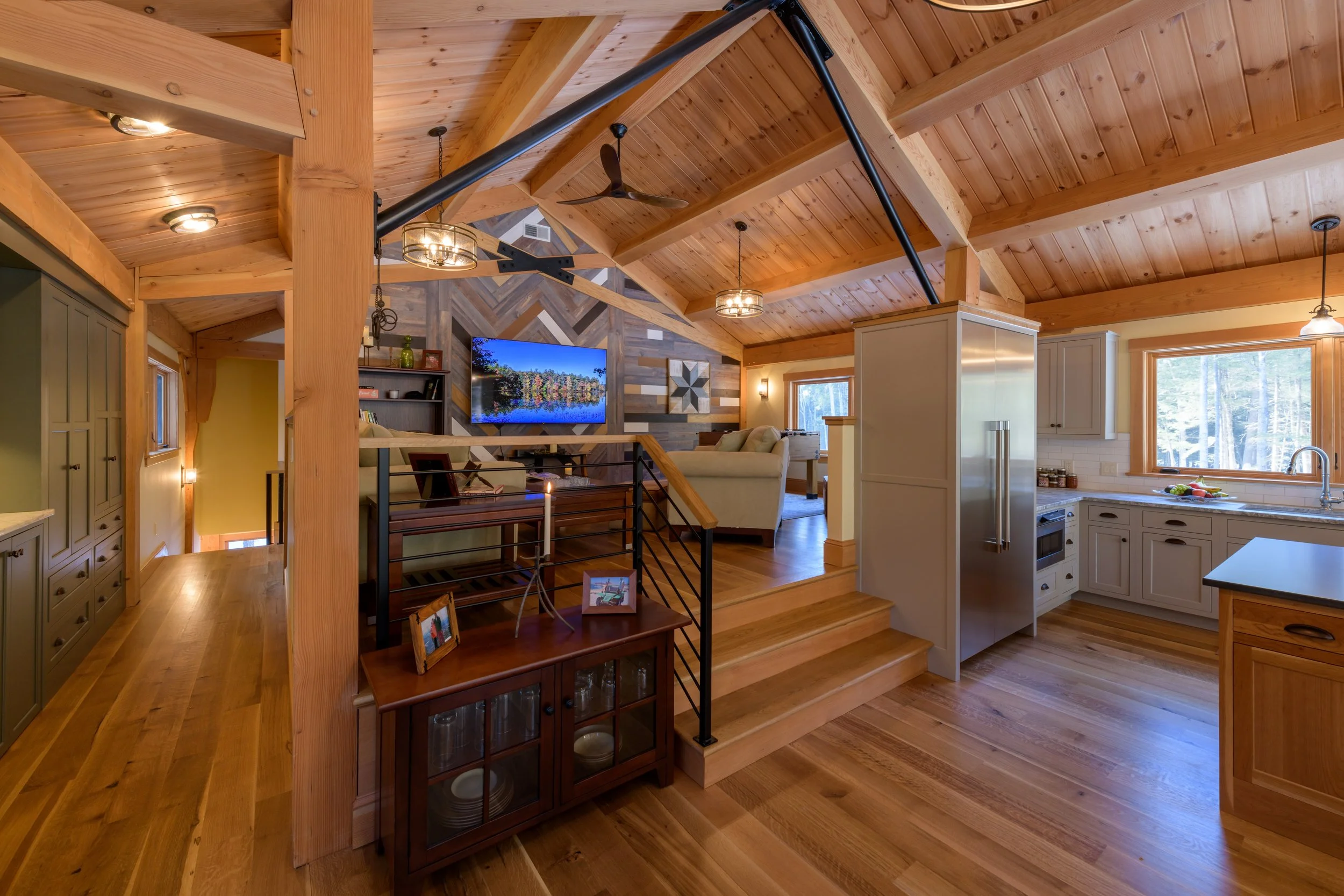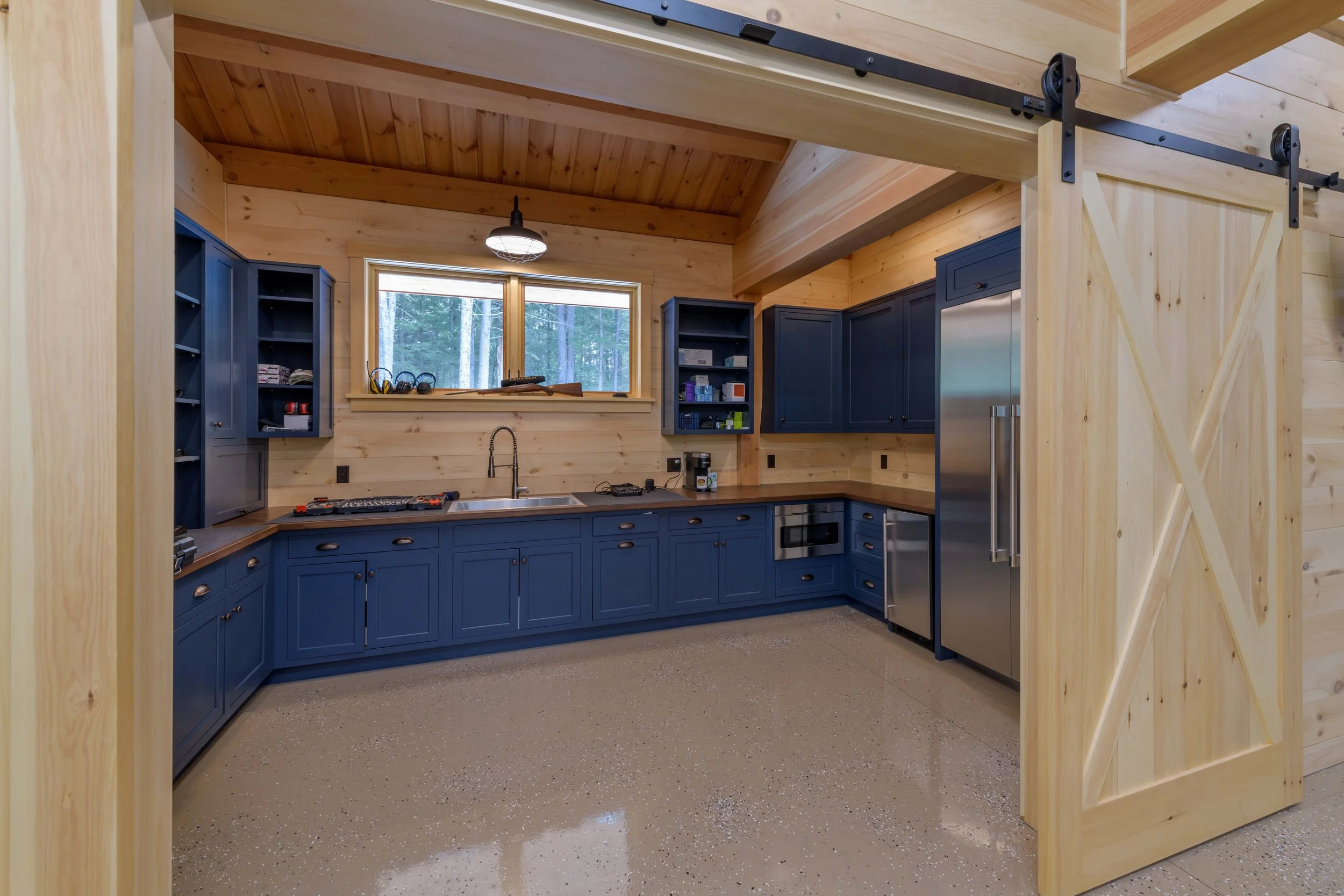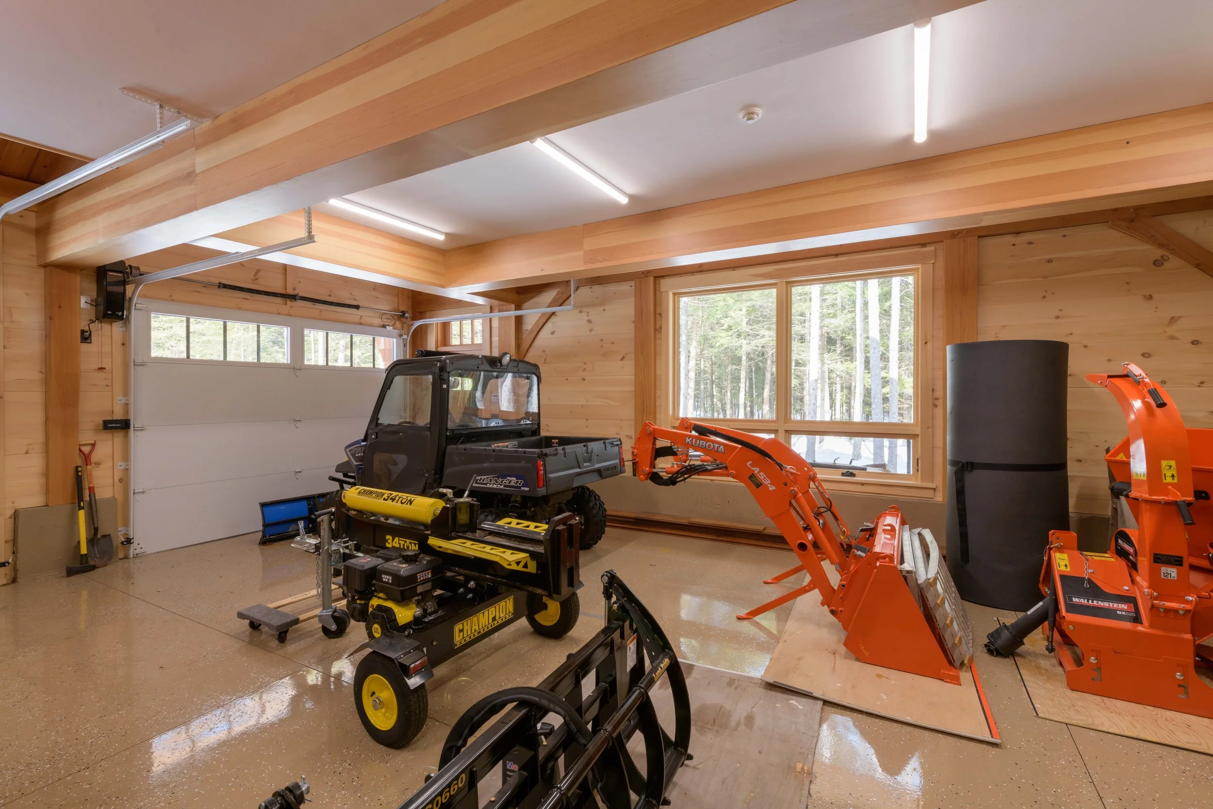 This barn-style space has five bays for cars and equipment, a workshop, and a full bathroom, all on the first floor, plus room for storage, tools, and easy access to clean up after chores. The second floor has two bedrooms, two baths, and ample living space. The kitchen, living, dining, and bar area are open to one another and showcased by the timber-framed cathedral ceiling—a covered deck with views to the river. Guests, family, and friends can relax comfortably above the functional storage and workspaces below.
