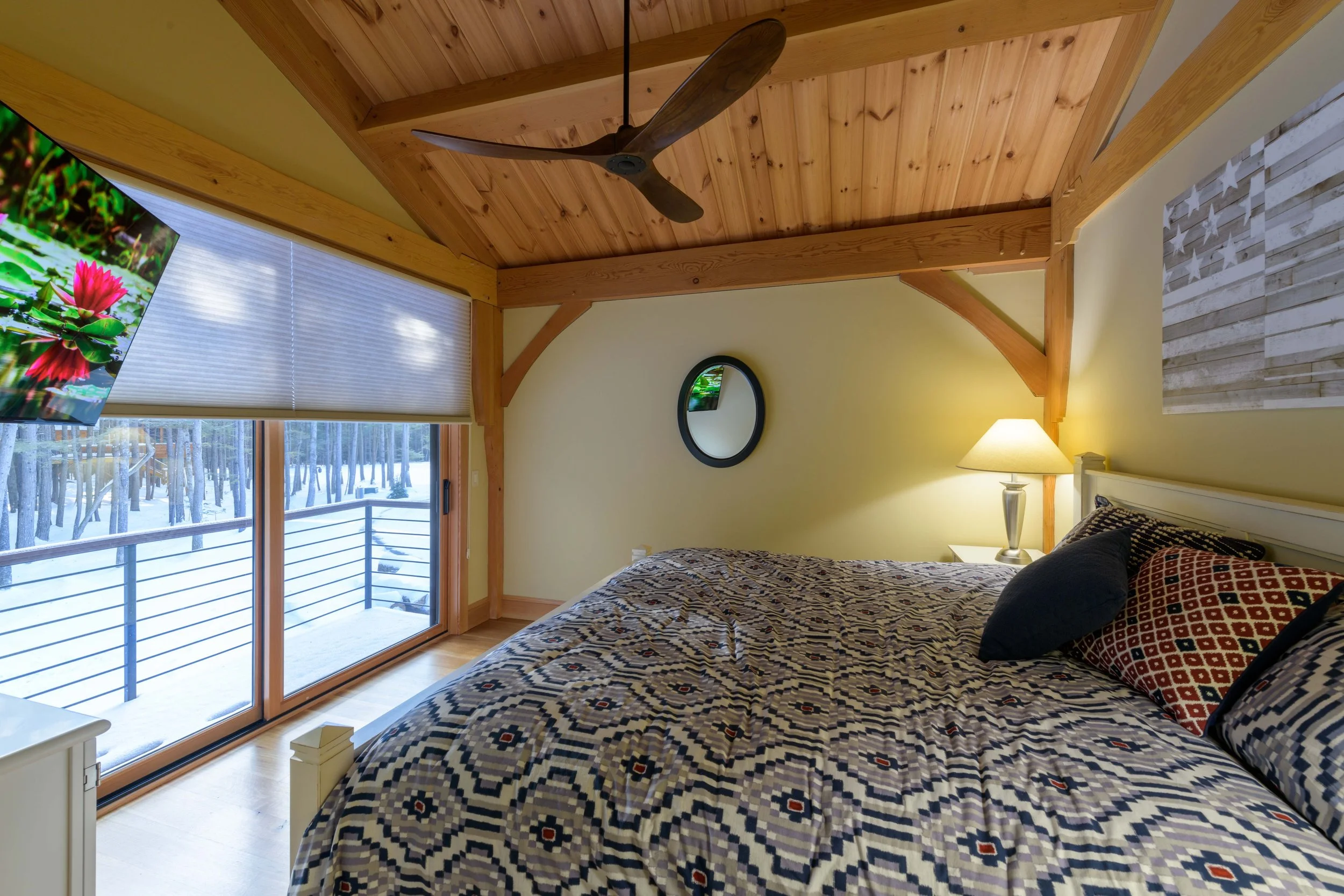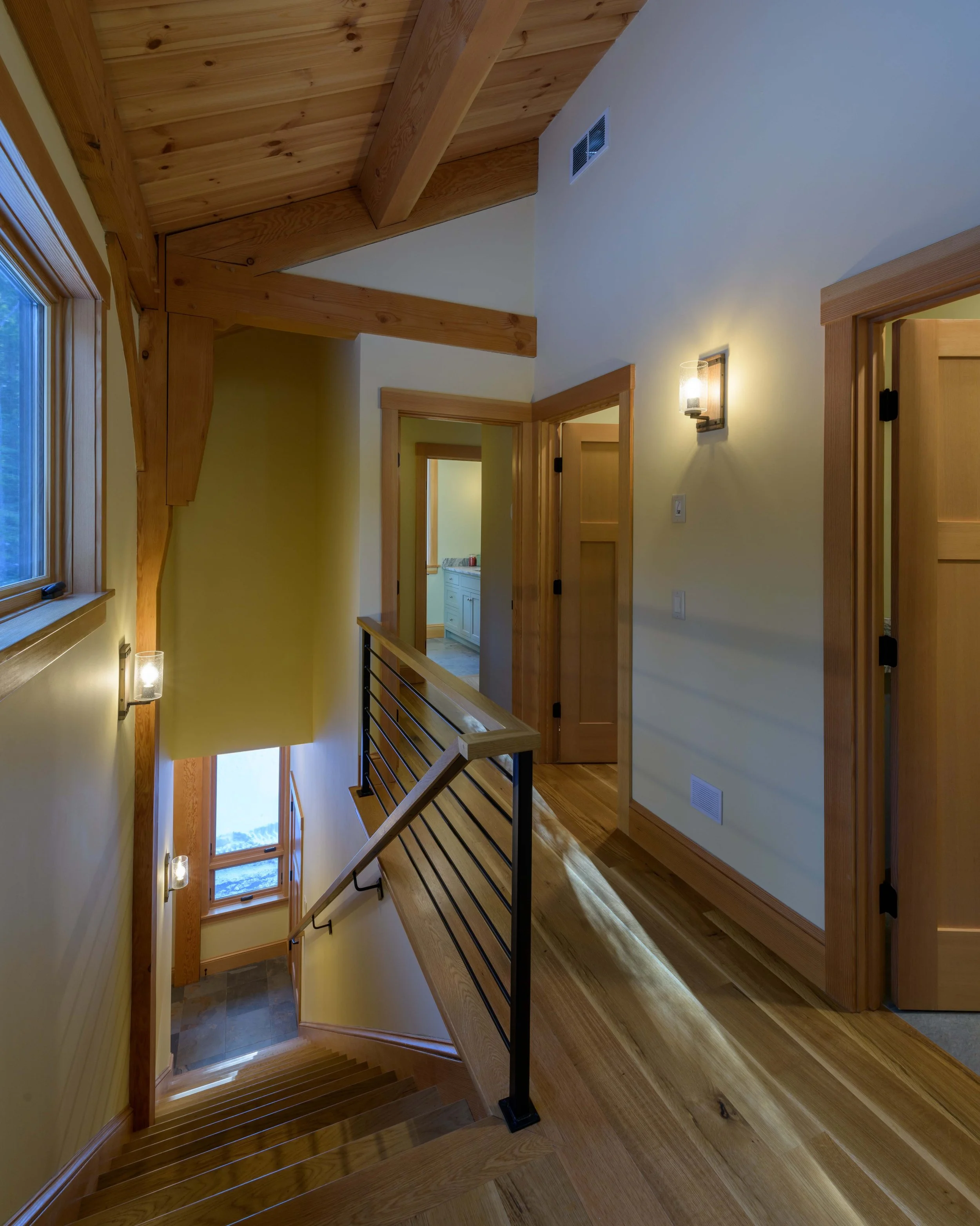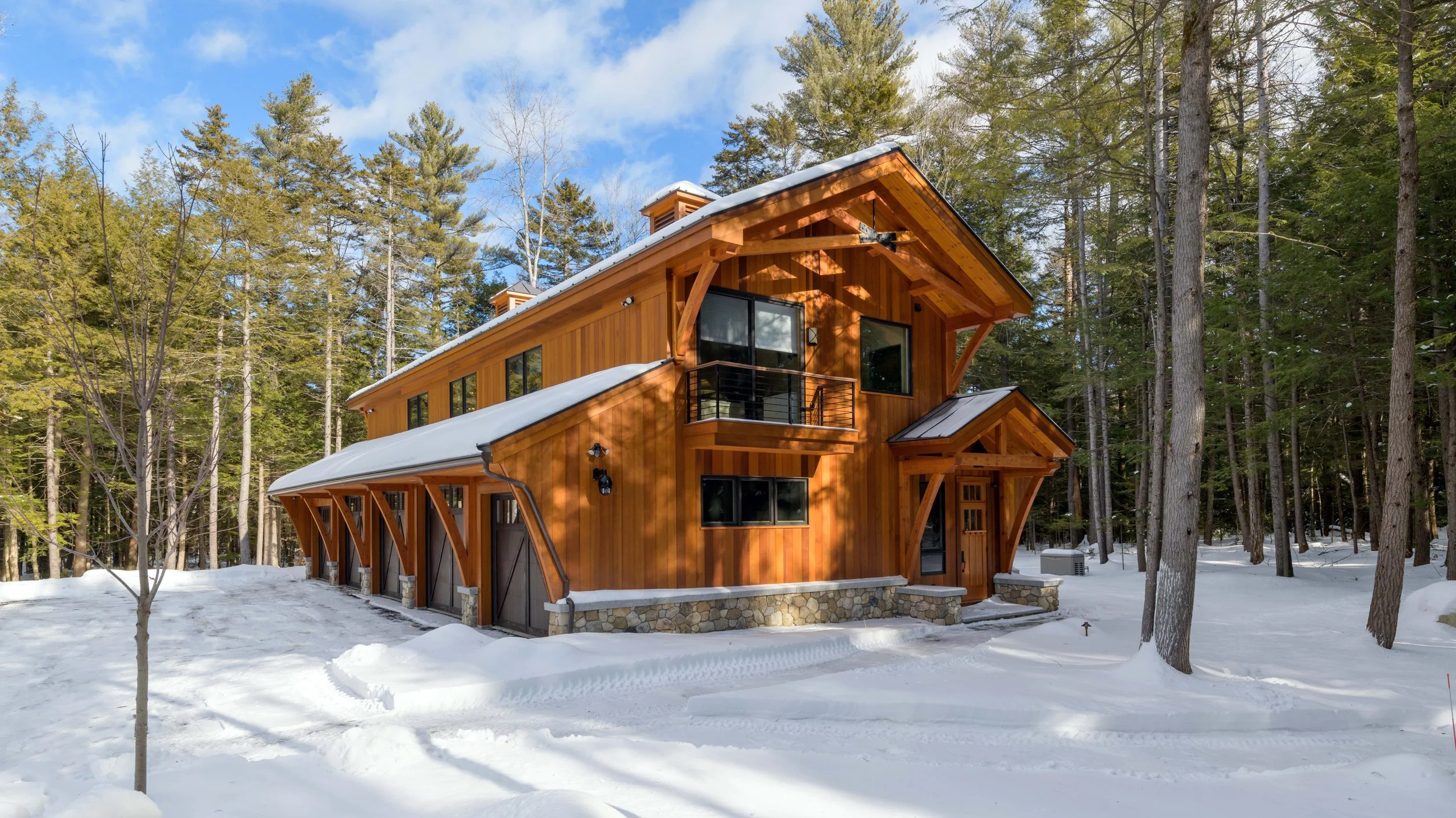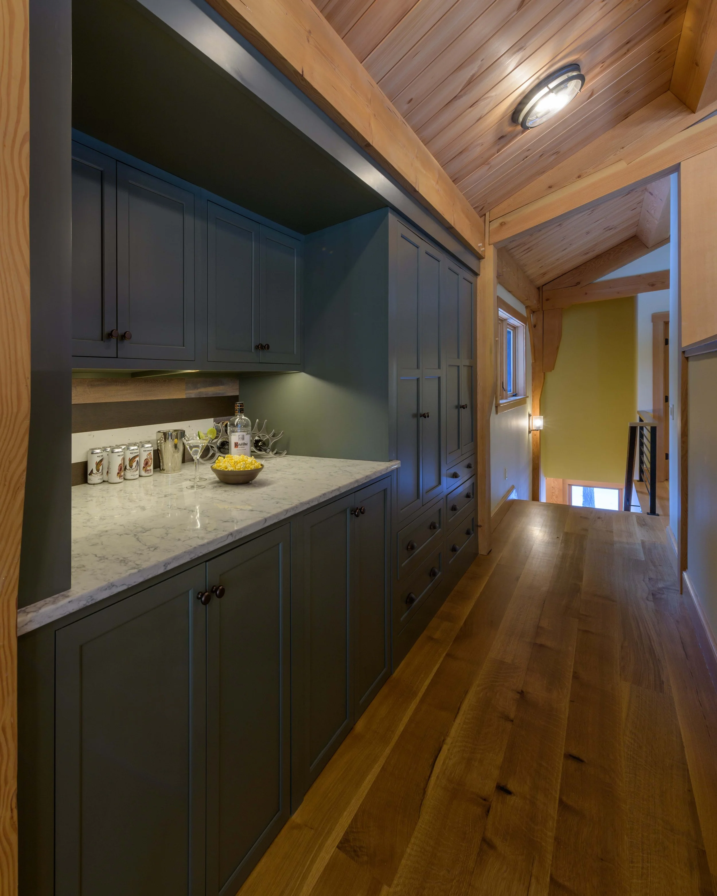 This barn-style space has five bays for cars and equipment, a workshop, and a full bathroom, all on the first floor, plus room for storage, tools, and easy access to clean up after chores. The second floor has two bedrooms, two baths, and ample living space. The kitchen, living, dining, and bar area are open to one another and showcased by the timber-framed cathedral ceiling—a covered deck with views to the river. Guests, family, and friends can relax comfortably above the functional storage and workspaces below.