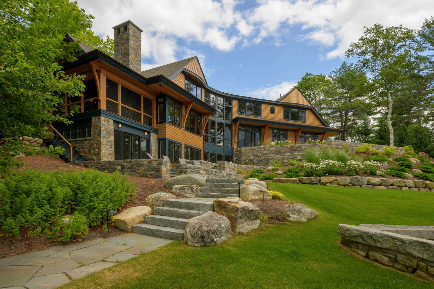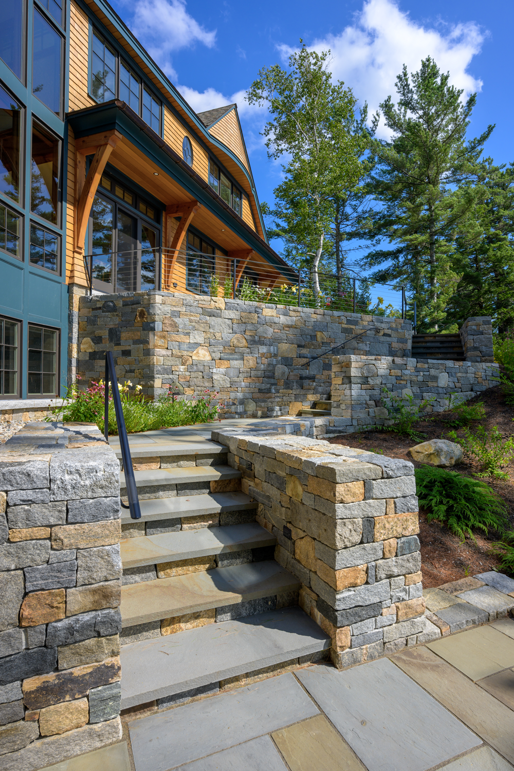 The walkout design of this home is unique and informed by the topography of the lot. The desire for outdoor living spaces adjacent to primary living spaces on both the main floor and lower level presented a design opportunity to create multiple levels of outdoor living spaces. The ashlar bluestone patios on the lakeside are supported by burly stone walls assembled from a custom mix of New England granite field stones.